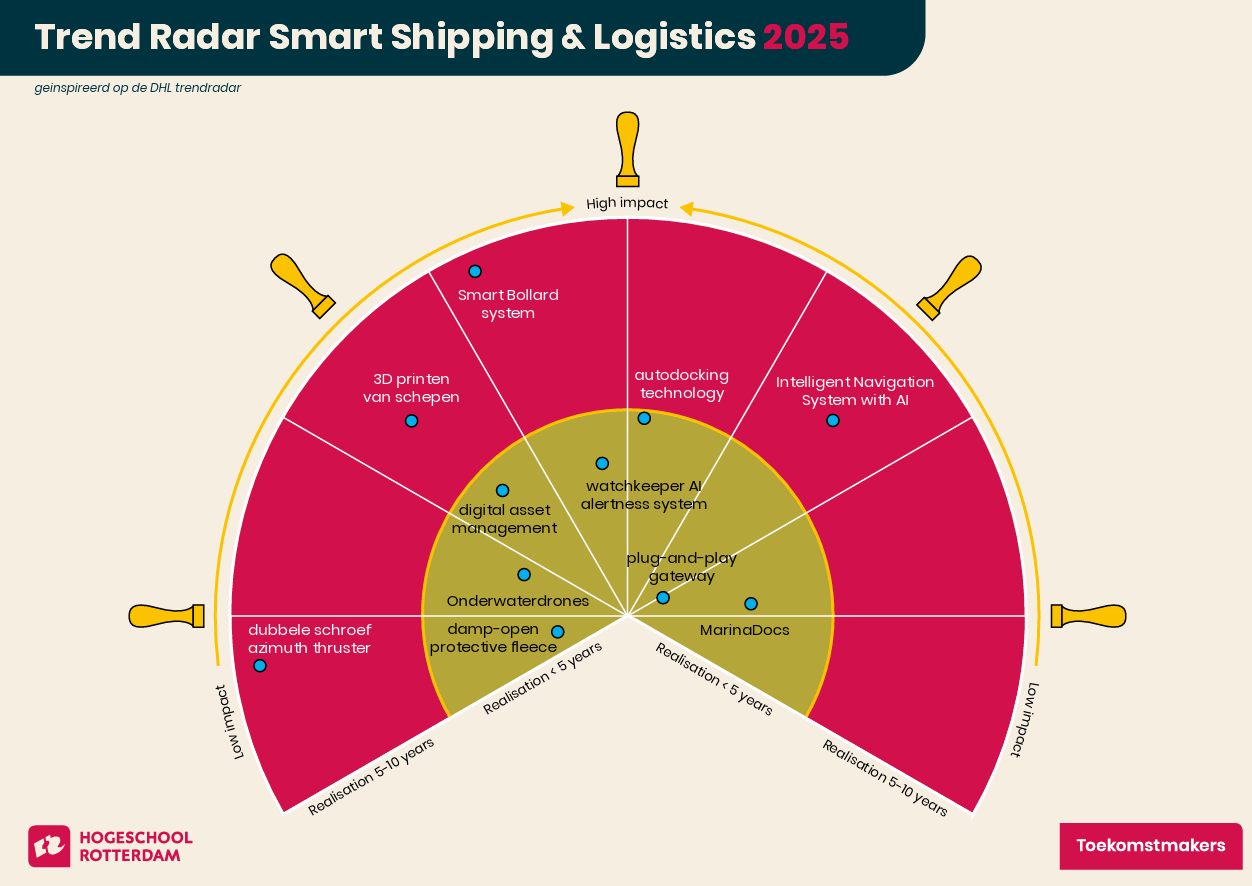 De Trend Radar Smart Shipping & Logistics presenteert innovaties en ontwikkelingen op het gebied van geautomatiseerd en autonoom varen. Het doel van de radar is om bedrijven en studenten een overzicht te geven van het dynamische speelveld van smart shipping en intelligente oplossingen in de logistiek.