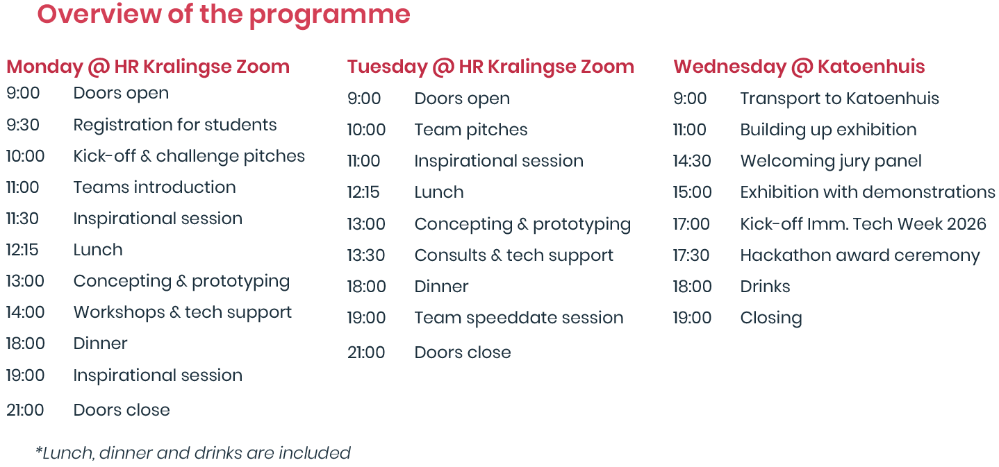 De officiële inschrijving voor studenten opent op donderdag 6 november 2025 en sluit op dinsdag 25 november. Wil je deelnemen, neem dan contact op met je docent of je deze dagen lessen kunt missen. Docenten en medewerkers worden verzocht dit formulier in te vullen. We vragen onderwijsinstellingen een vergoeding voor catering voor studenten van €50-€75 per student. Ook hebben wij medewerking van docenten en medewerkers nodig – van het werven van studenten en het voorbereiden van activiteiten tot coaching tijdens het evenement. Neem bij vragen contact op met immersivetech@hr.nl