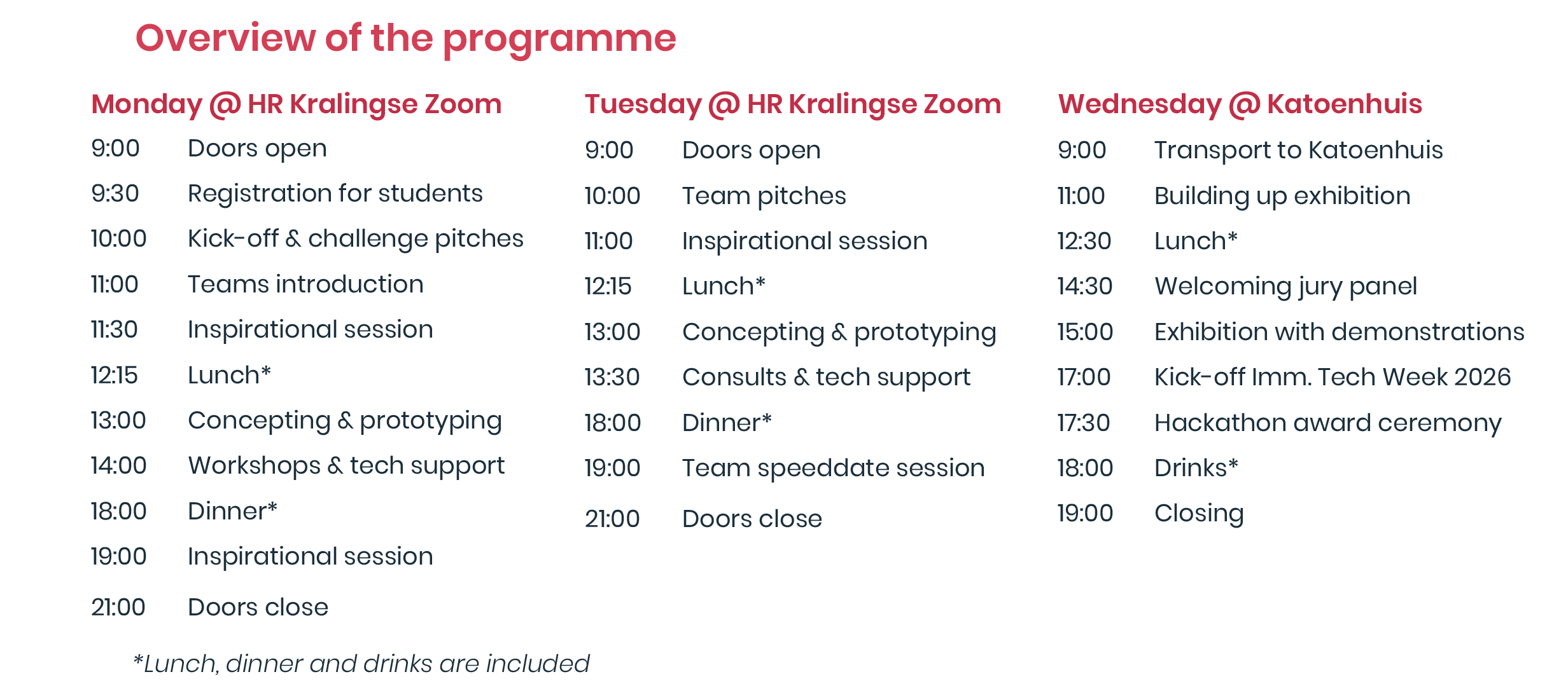 Students can register between Thursday 6 November and Tuesday 25 November. If you wish to participate, please contact your teacher to check whether you can miss classes on these days. Teachers and staff are requested to complete this form. We kindly ask educational institutions to contribute €50–€75 per student towards catering costs. We also need teachers and staff to help with various tasks, from recruiting students and preparing activities to coaching during the event. If you have any questions, please email immersivetech@hr.nl.