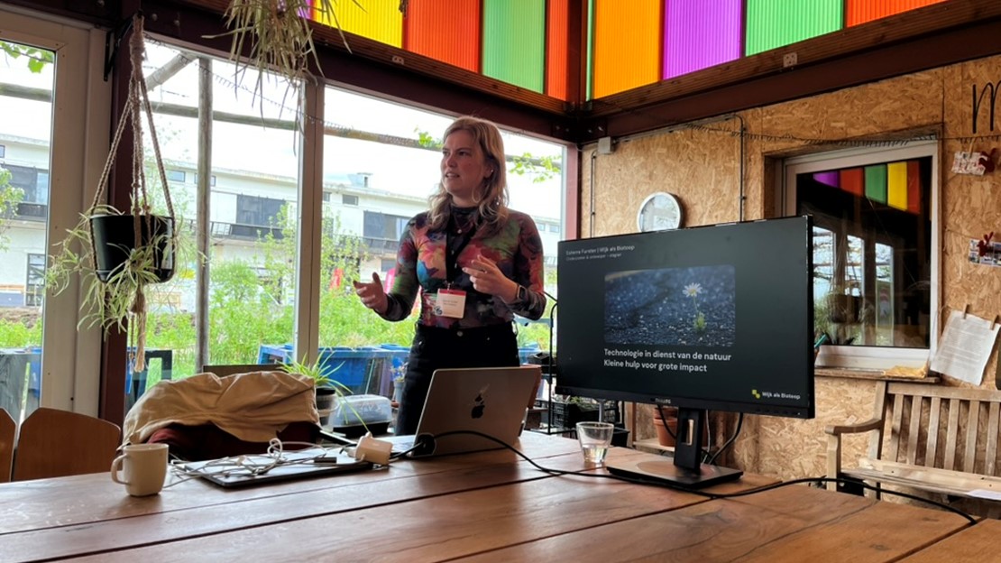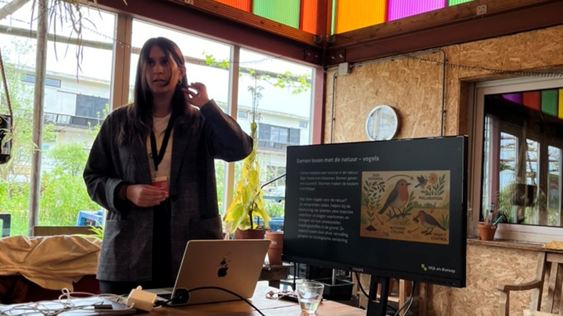 Tijdens deze bijeenkomst stond de wisselwerking tussen mens, natuur en technologie centraal. Alyshia trapte af met een inspirerend verhaal over vogels in de stad – over waar ze tegenaan lopen, maar ook hoe vogels en mensen elkaar kunnen helpen om samen een leefbare omgeving te creëren. Daarna ontstond een levendige discussie: bezoekers schreven hun eigen ideeën en observaties op kleurrijke stickynotes, die samen een bont overzicht vormden van inzichten uit de wijk.