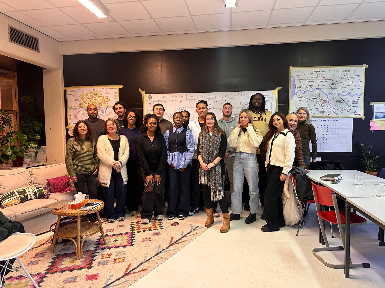 Het is een mooie diverse groep met verschillende achtergronden, ervaringen en expertises. Dat is iets wat we meteen benadrukken. Terwijl Alexander de bredere maatschappelijke context schetst en uitleg geeft over het verbeteren van de sociale basis, luisteren de studenten met aandacht. Daarna legt Bram Dingemanse, netwerkregisseur Huize Middelland) uit hoe in Middelland vanuit de wijk geïnvesteerd wordt in die sociale basis. Dat zij, de 12 buurtinitiatieven van Huize Middelland, hier ontdekt hebben dat het maatwerk ondersteund moet worden, dus dat er niet van bovenaf een overkoepelend orgaan moet zijn. Maar dat van onderaf ondersteuning plaats moet vinden, waarbij het om gedeeld eigenaarschap gaat in plaats van sturing. Daarom doen bewoners samen met onderzoekers hun eigen onderzoeken in de wijk en vergroten bewoners hun eigen invloed. Alle studenten worden van harte uitgenodigd om de wijkplekken te bezoeken en ‘embedded’ te werken de komende maanden. Dat wil zeggen ‘onderdeel te worden’ van het netwerk van netwerken in Delfshaven, door mee te doen en op de plek(ken) zelf aanwezig te zijn en het perspectief van die plekken en mensen zichtbaar te maken. Hier in Delfshaven dus aanwezig zijn op de plekken waar bewoners zijn, naast hen staan en samen met hen te onderzoeken en hun perspectief zichtbaar te maken of hen als groep een stem te geven.