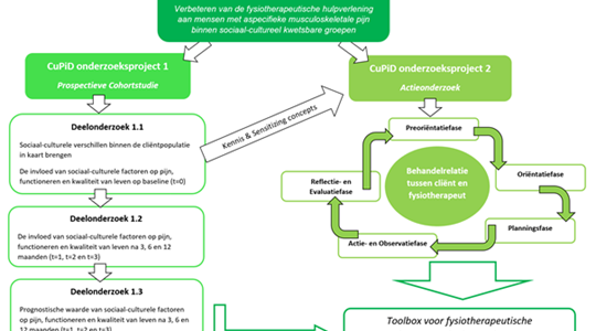De CuPiD-studie heeft als doel om de fysiotherapeutische zorg voor patiënten met aspecifieke musculoskeletale pijnklachten te verbeteren. Enerzijds wordt dat gedaan door te kijken naar verschillen in de ervaring van pijn, beperkingen en kwaliteit van leven tussen groepen patiënten met verschillende sociaal-culturele achtergronden. Zo wordt er gekeken naar de rol van woonsituatie, opleidingsniveau, afkomst en taal. Anderzijds wordt in het onderzoek gekeken of sociaal-culturele factoren mogelijk voorspellers zijn voor het hebben van klachten op langere termijn.