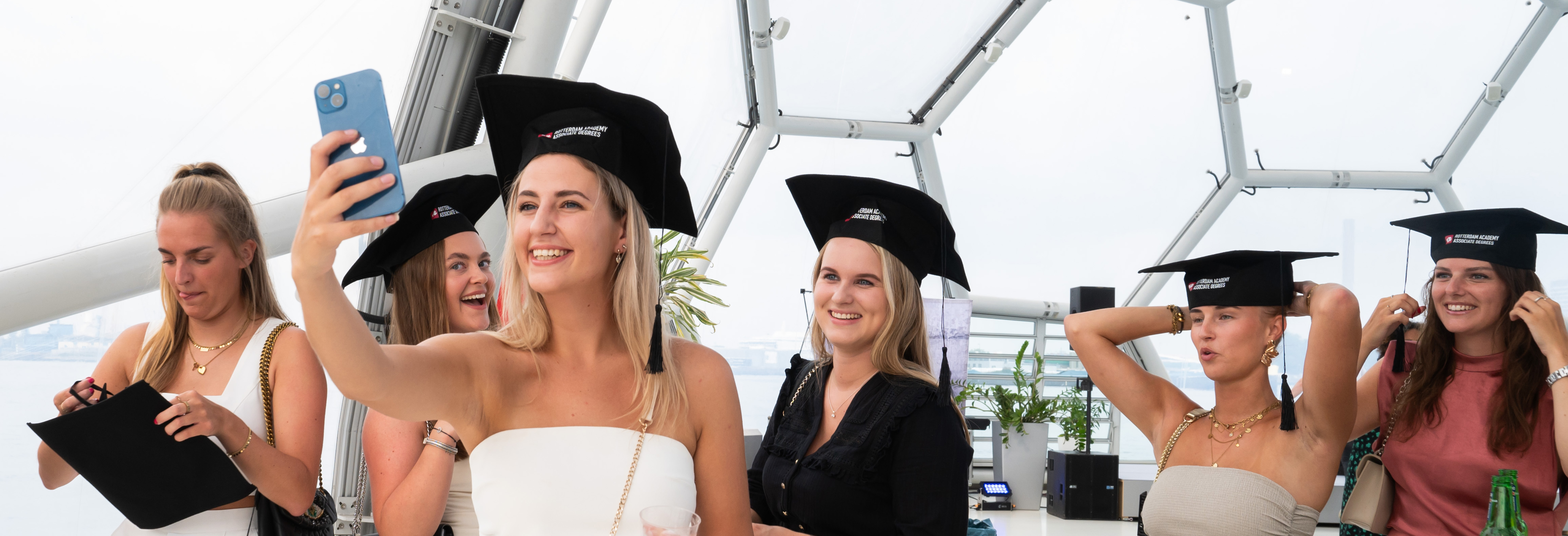 Foto: Laura met haar vriendinnen tijdens de diplomering op de Bollen in Rotterdam. Fotograaf: Hans Tak