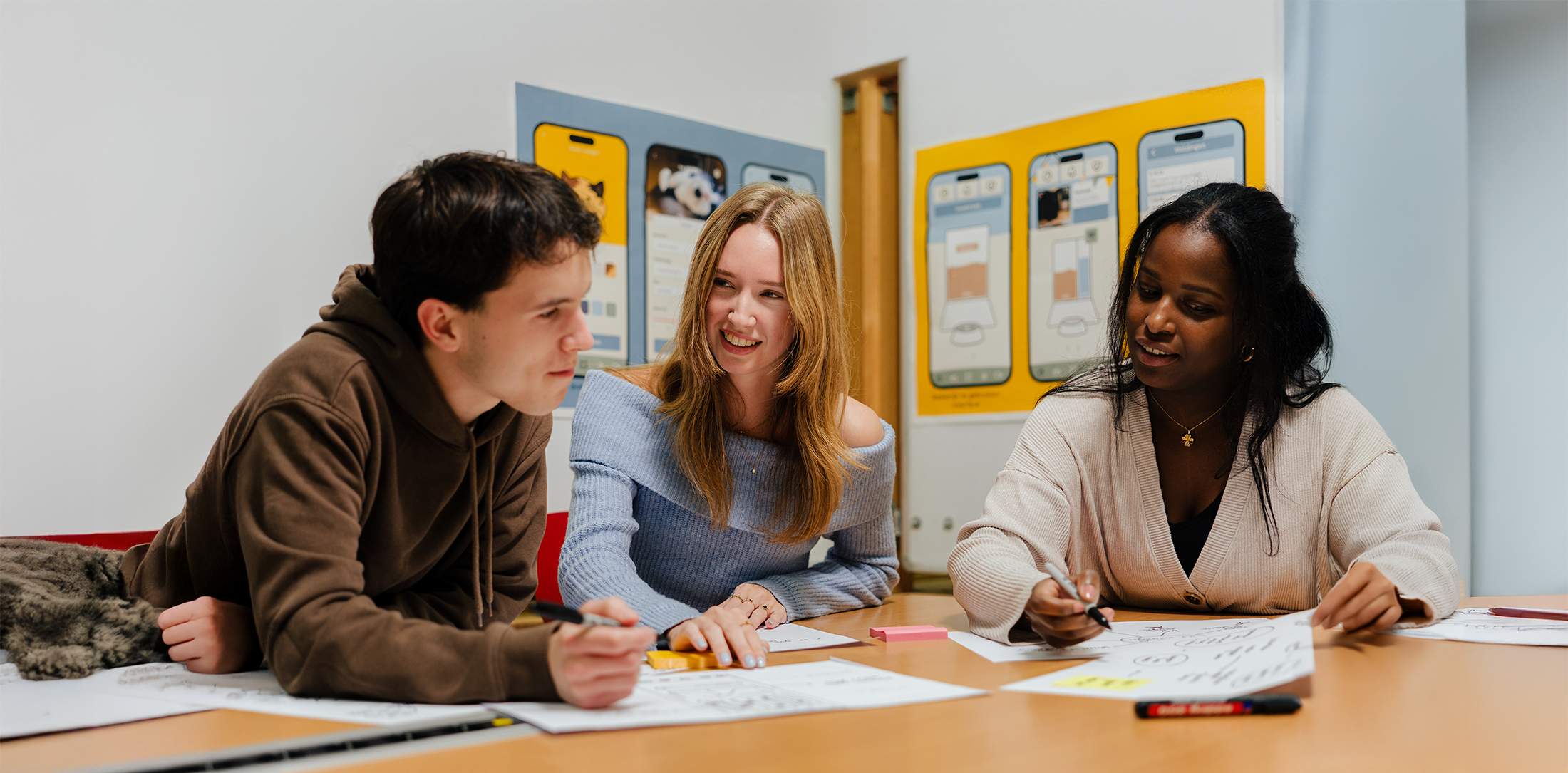 In het eerste jaar ga je vaardigheden leren die je als CMD’er nodig hebt. Tijdens het vak Design Skills trainen we je in het ontwikkelen van je visuele communicatiekracht. Je leert hoe je als ontwerper met beeld kunt communiceren en je leert hoe je op een eenvoudige maar doeltreffende wijze situaties kunt verbeelden en patronen en verbanden inzichtelijk kunt maken. Ook oefen je met het toepassen van de belangrijkste esthetische basisprincipes. Daarnaast besteden we aandacht aan het werken met belangrijke design tools (zoals Figma) en leer je hoe je eenvoudige prototypes kunt bouwen. Hierbij maak je gebruik van technieken als generatieve AI, Micro:bit of HTML/CSS. De geleerde vaardigheden kun je direct toepassen in de Design Challenges en in de opdrachten waaraan je met je projectteam werkt in de studio’s.