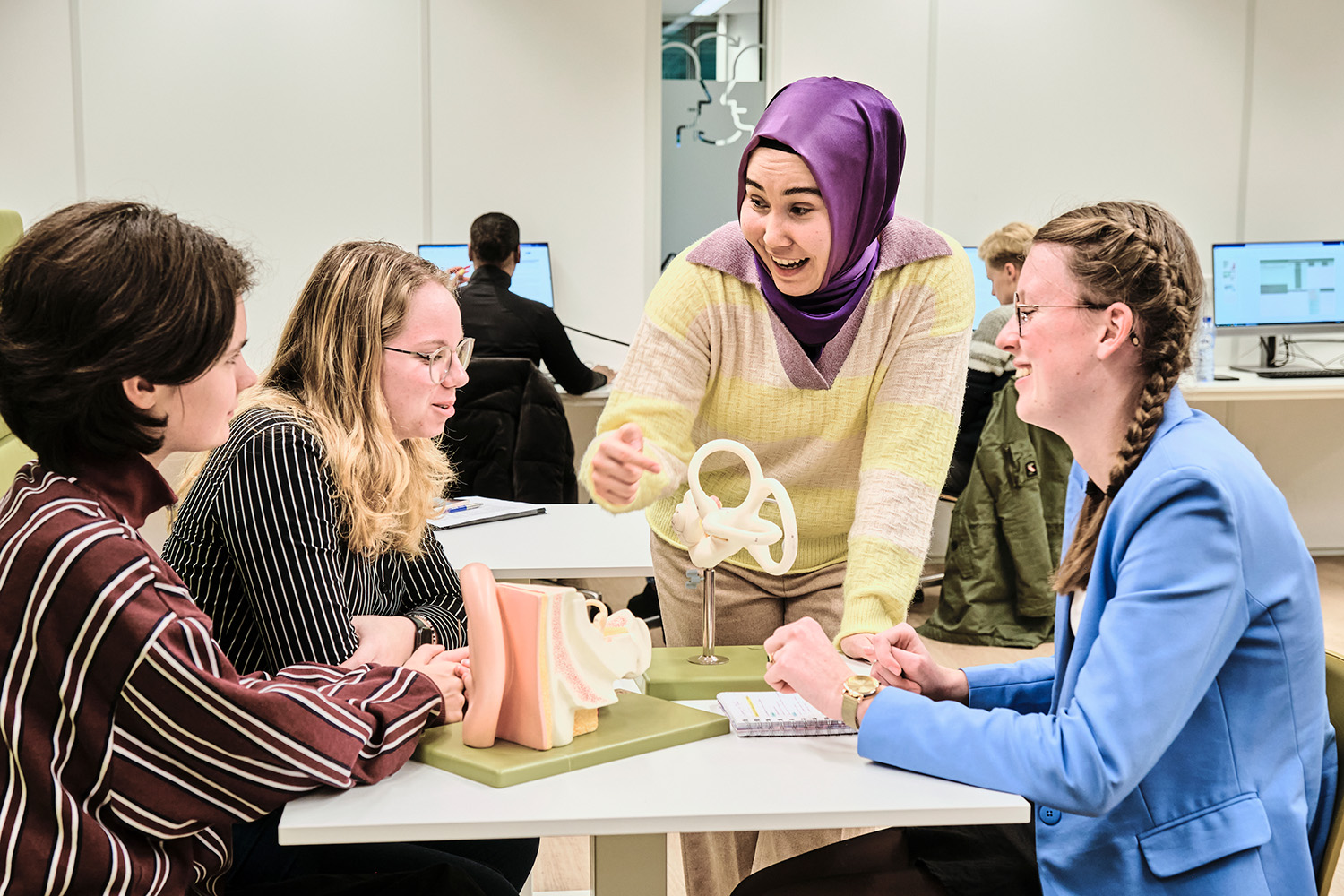Bij de start van je studie ligt de nadruk op het ontwikkelen van kennis en vaardigheden, maar direct komt ook de praktijk aan bod. Je leert reële beroepsvraagstukken aan te pakken, in samenwerking met medestudenten, docenten, professionals uit de praktijk en praktijkgerichte onderzoekers. Eerst krijg je veel begeleiding van je docent, later neem je steeds meer het heft in eigen handen. Tijdens je studie leer je jezelf steeds beter kennen en ontdek je wat jouw unieke kwaliteiten zijn als beroepsbeoefenaar.