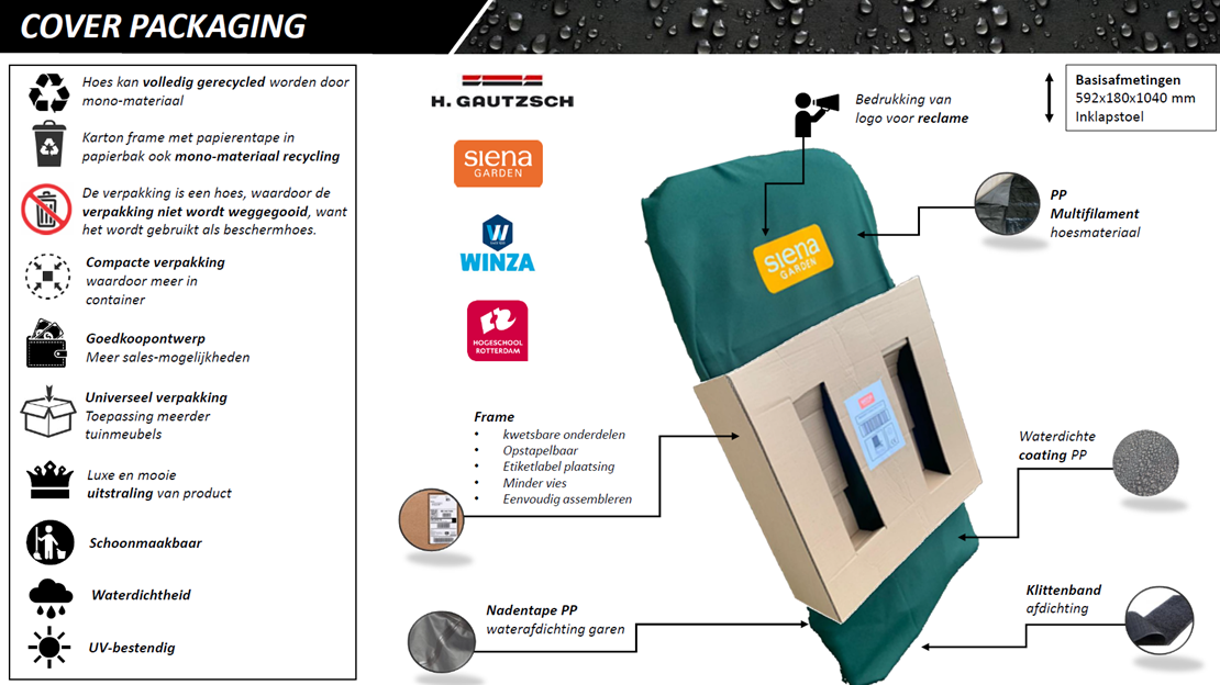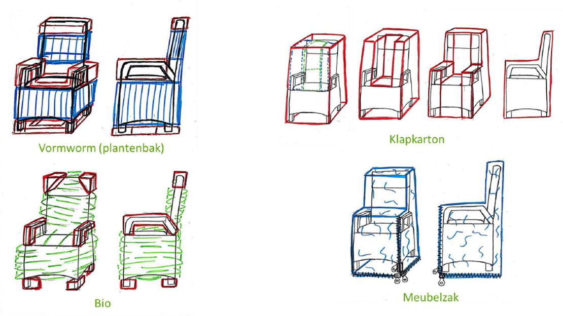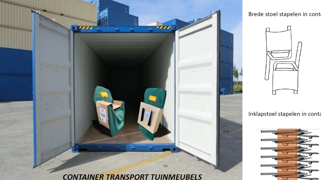 Onderzocht is hoe tuinmeubilair van verschillende vorm en maat verpakt en getransporteerd worden door allerlei materialen en bestaande verpakkingen te vergelijken. Vele schetsen en schaalmodellen zijn gemaakt en voorgelegd aan de opdrachtgever. Leveranciers zijn gezocht, kosten doorgerekend.