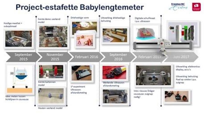 In een traject van interprofessionele onderwijsprojecten door multidisciplinaire studententeams en in nauwe samenwerking met verpleegkundigen en neonatologen van de NICU van het Erasmus MC is het estafetteproces gestart. Hierbij ontstond een idee voor een systeem, waarbij de couveusebaby vanaf buiten gemeten werd tussen twee nauwkeurige, geprojecteerde lichtlijntjes, ter voorkoming van het inbrengen in de couveuse van een onhandig, onhygienisch instrument. Het ontwerp houdt rekening met de complexe omgeving en werd tussentijds aangepast bij veranderende omstandigheden.