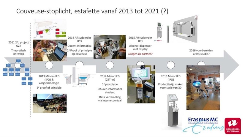In een estafette van interdisciplinaire samenwerkingen tussen studenten uit de Zorg, Engineering en Communicatie, Media Design en Informatietechnologie is het handdesinfectie-feedback-systeem voor couveuses ontwikkeld. Dit is te vergelijken met een ‘stoplicht’ dat op groen gaat, zodra de handen op juiste wijze zijn gedesinfecteerd. Indien een test op de neonatale intensive care unit van het Erasmus MC-Sophia aantoont dat het vernieuwende concept effectief is, vergroot dit de kans dat ziekenhuizen dit ‘stoplicht’ op gaan nemen of dat bedrijven nieuwe generaties couveuses hiermee gaan uitrusten.