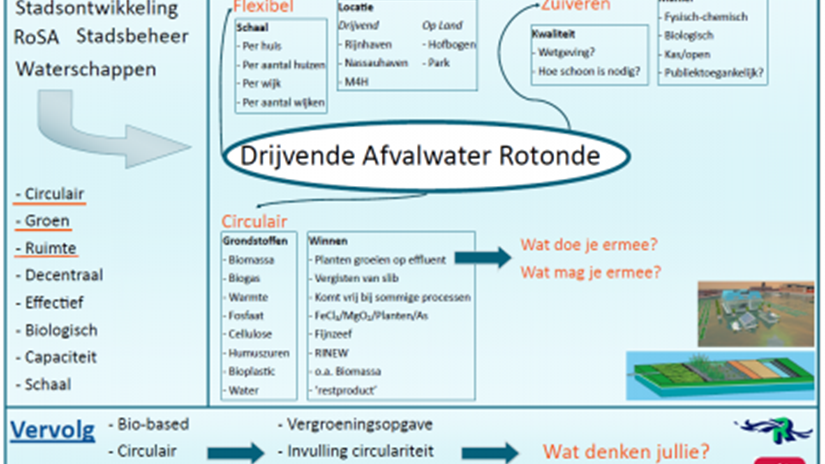 Hoe kan het concept 'Drijvende Afvalwaterrotonde' verder worden uitgewerkt, zodat deze kan worden toegepast binnen Rotterdam? De drijvende afvalwaterrotonde is een afvalwaterzuivering die circulair te werk gaat. Het doel is om afvalwater van drijvende, buitendijkse gebiedsontwikkeling te zuiveren, zodat er geen riolering door een dijk nodig is. Daarnaast is er de wens om zoveel mogelijk bruikbare grondstoffen uit afvalwater terug te winnen. Een voorbeeld hiervan is fosfor, wat een eindige grondstof is.