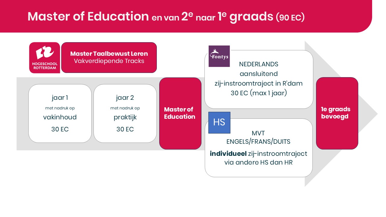Dankzij een unieke samenwerking met Fontys Educatie Tilburg kunnen studenten na het afronden van de vakverdiepende track Nederlands in maximaal 1 jaar hun 1e graads bevoegdheid in Rotterdam halen.
