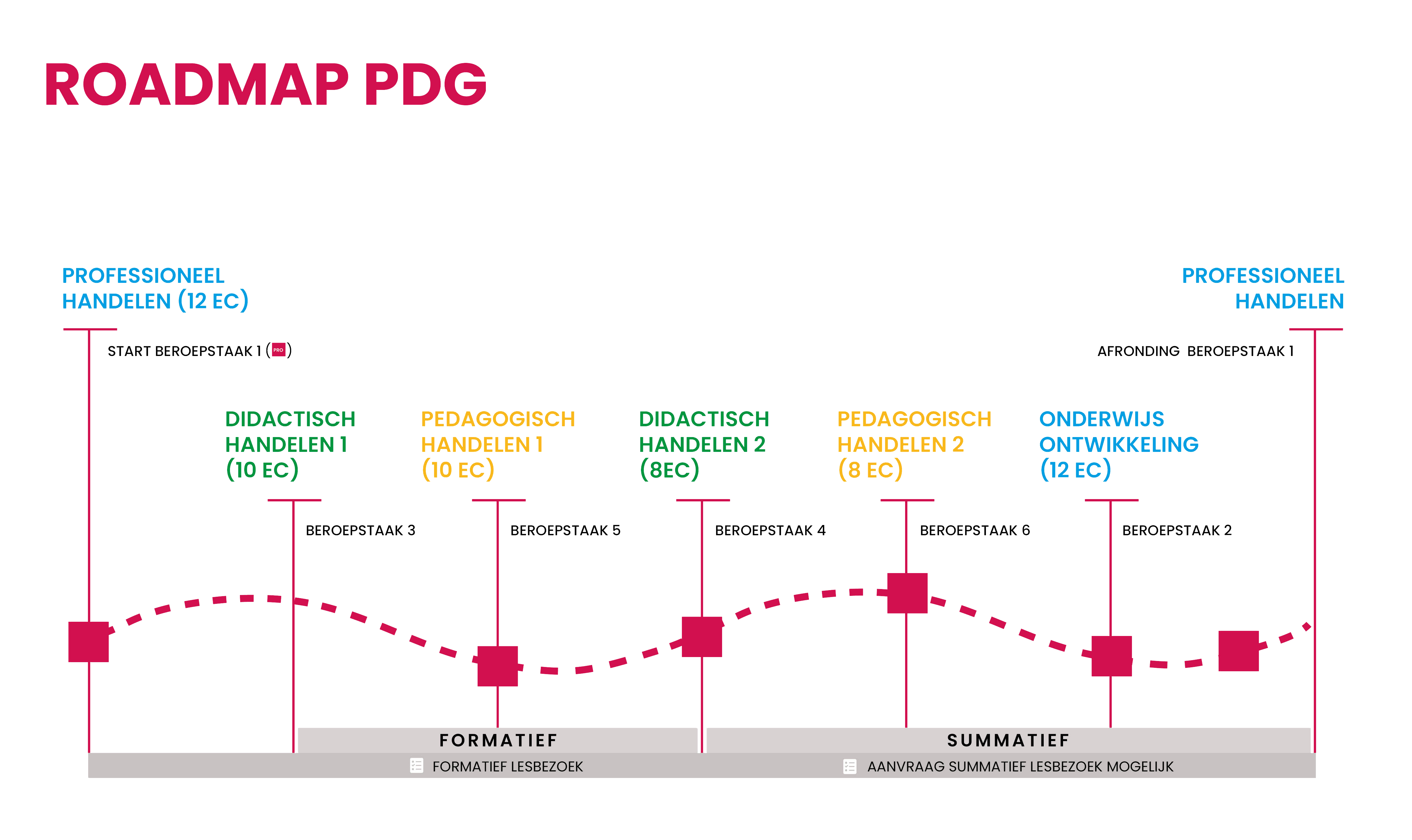 De roadmap laat zien hoe je in het PDG-traject toewerkt naar de leeruitkomsten en welke cursussen je hiervoor volgt. Elk cursus sluit je af met een beroepsproduct, waarin de inhoud van de cursus en werkplek samenkomen. De rode draad in het PDG-traject is de ontwikkeling van jouw professionele identiteit als mbo-docent.