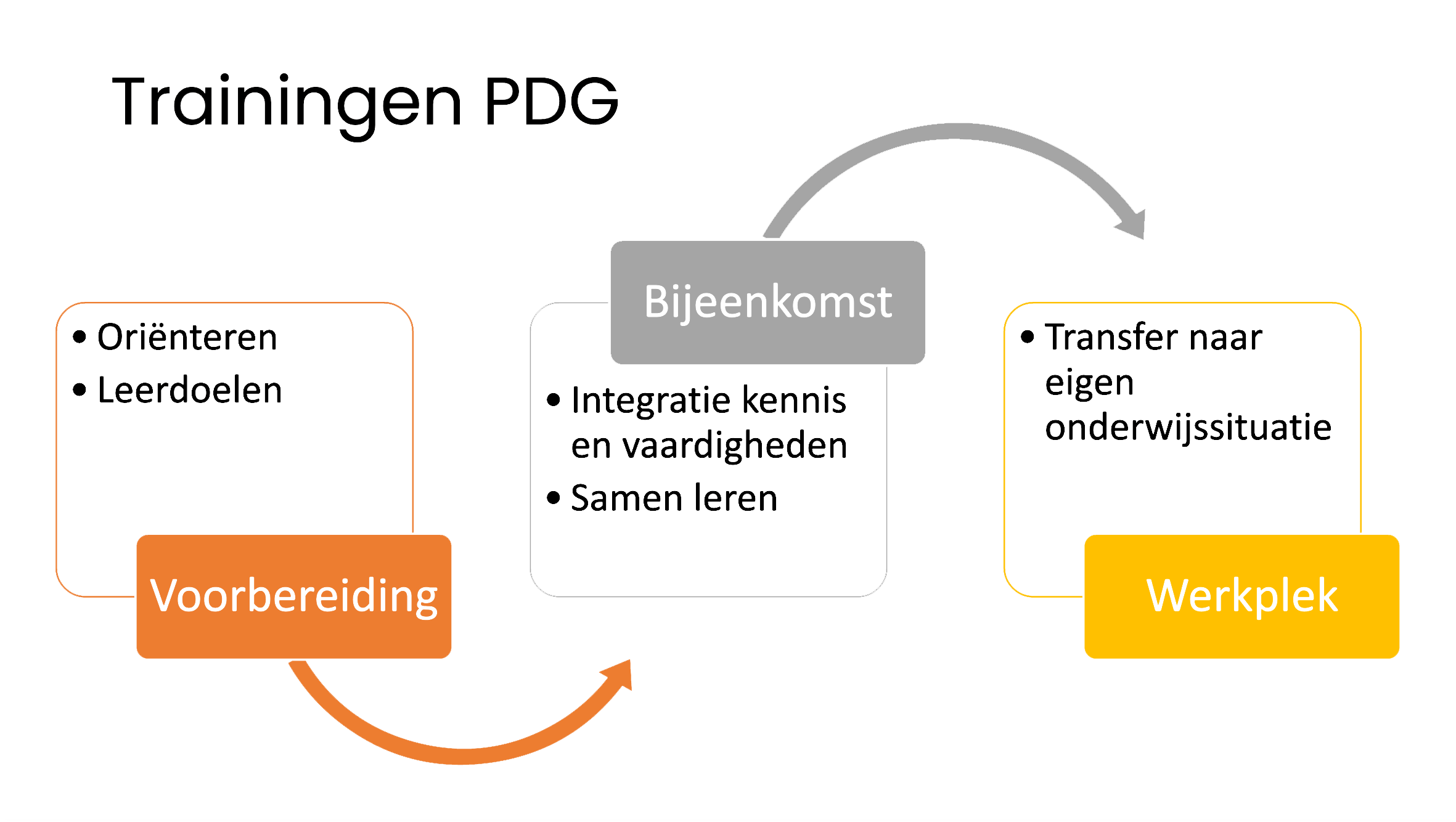 Hoe is de opleiding opgebouwd?Het PDG-traject is bedoeld voor professionals met minimaal drie jaren relevante werkervaring in een voor het mbo relevant beroep. Zij hebben minimaal een hbo-opleiding afgerond, of beschikken over tenminste aantoonbaar hbo werk- en denkniveau.