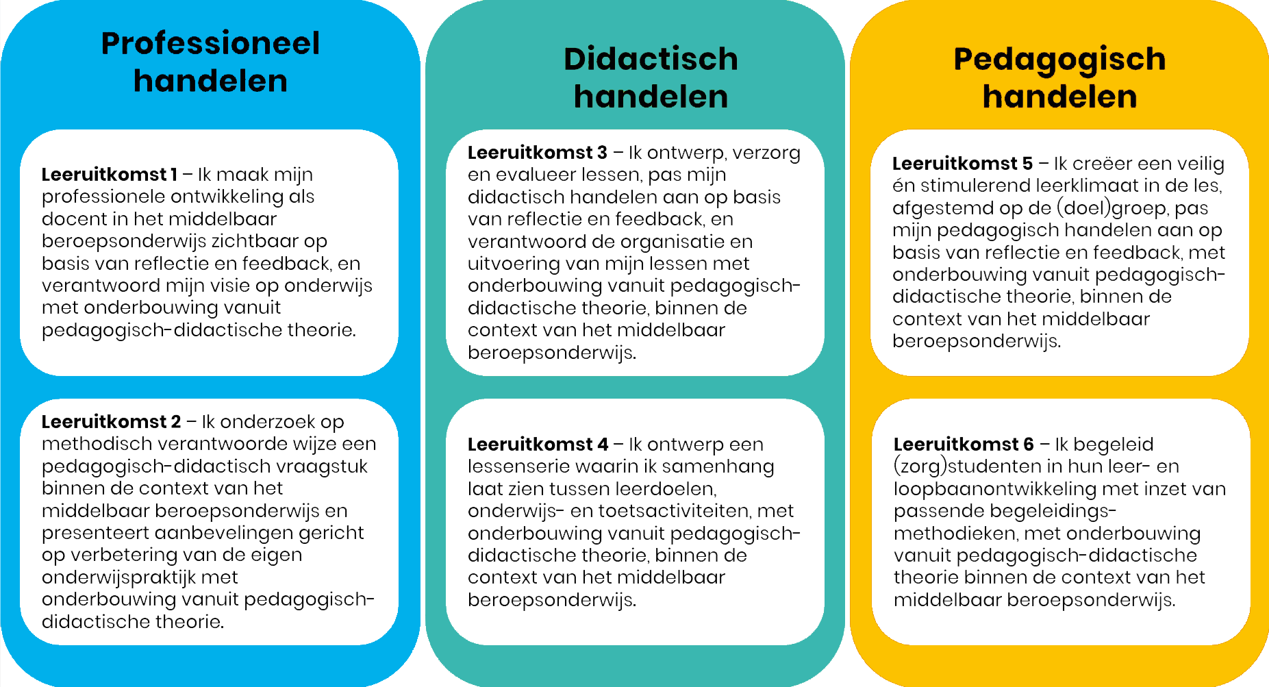 Het programma is gestructureerd op basis van 3 domeinen en 6 leeruitkomsten. Hieronder is afgebeeld waar je in het PDG-traject naar toe werkt.