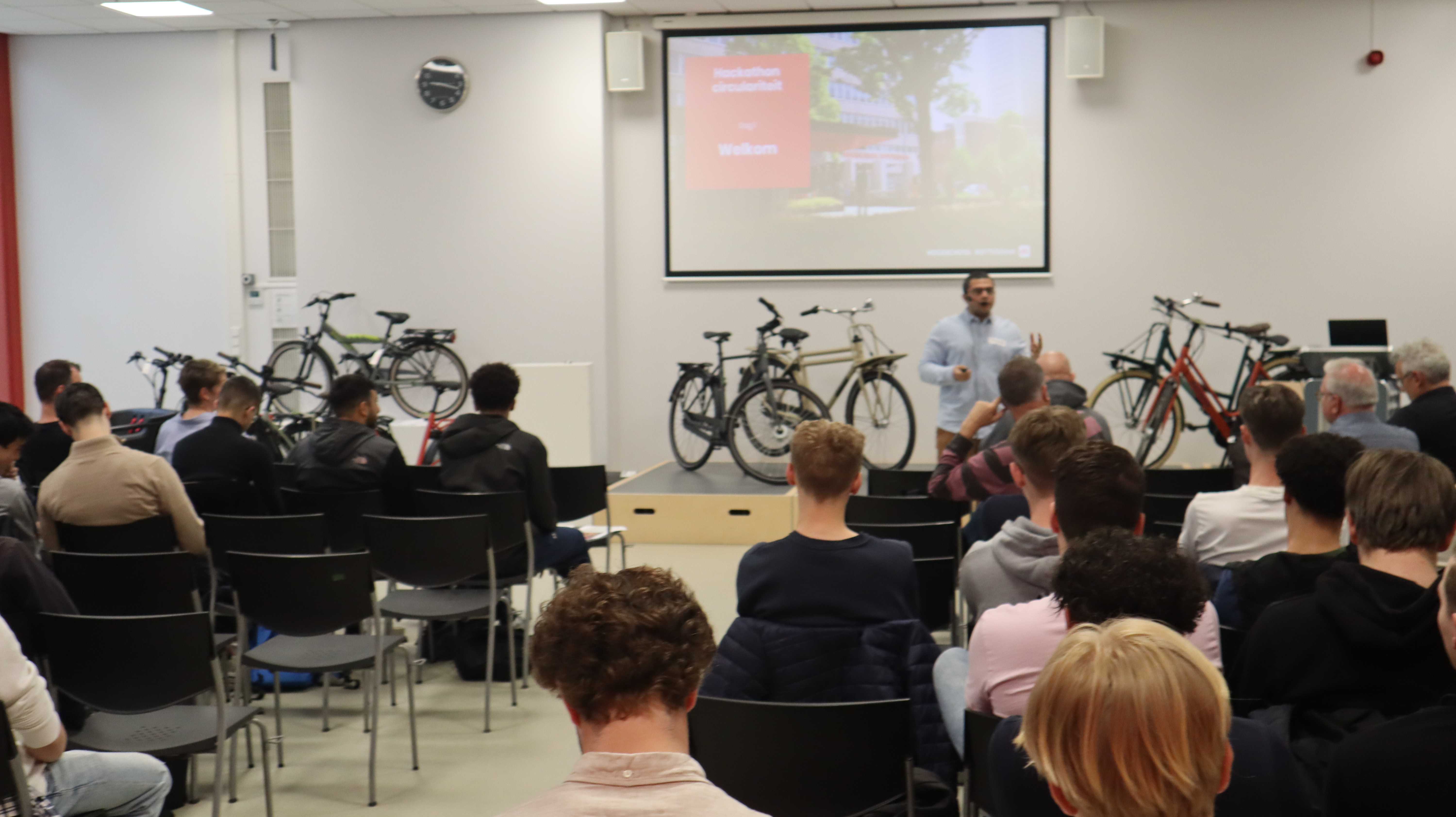 De studenten sloten de hackathon af met een pitch aan de jury. Die bestaat uit opdrachtgever Accell Group, experts op het gebied van circulariteit en docenten Technische Bedrijfskunde.
