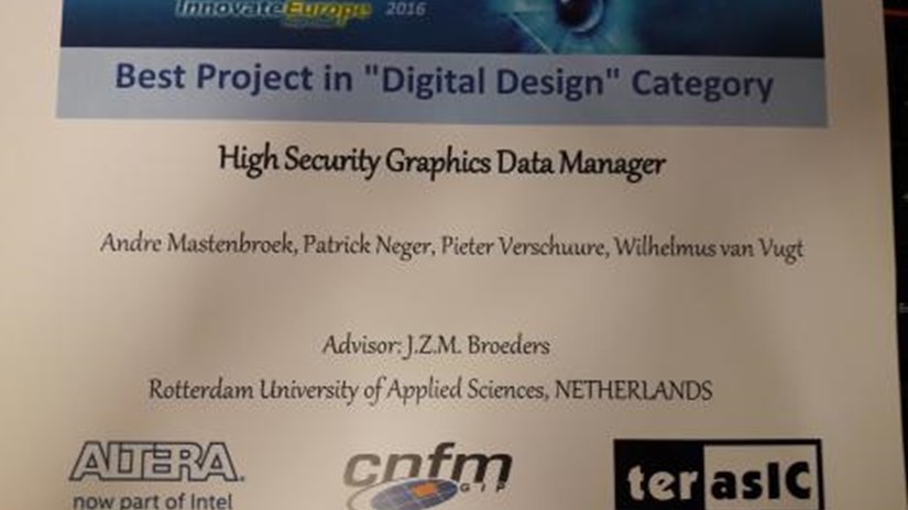 Namens Hogeschool Rotterdam heeft het projectteam deelgenomen aan de “Altera Innovate Europe Design Contest 2016”. Het doel van de wedstrijd is om een innovatieve oplossing te realiseren met een FPGA van Altera. In huidige videoverwerkingen worden de verbindingen naar de output softwarematig opgebouwd en geïsoleerd. Deze software is ten opzichte van hardware gevoeliger voor het ontvreemden van informatie. Daarnaast worden alle pixels per venster berekend. Dit vergt veel rekenkracht en tijd van de CPU.