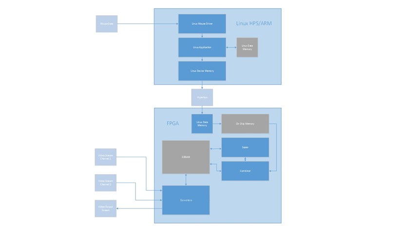 Om te garanderen dat de videodata niet toegankelijk is voor de gebruiker, is tijdens het ontwerpproces een scheiding aangebracht. De videodata wordt opgeslagen op een locatie waar het OS geen toegang heeft. Op papier is een ontwerp gemaakt waarbij iedere student een deelcomponent van het systeem voor zijn rekening nam. Hierbij is onderscheid gemaakt in het operating system, de dataconversies, het schalen van videodata en uiteindelijk het samenvoegen van het outputframe. Deze ontwerpen zijn uitgewerkt en gebruikt als basis voor het schrijven van software voor de FPGA.