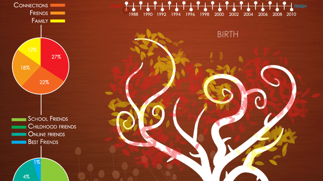 Het resultaat was een boom die mij voorstelt. In die boom heb je blaadjes van verschillende kleuren. Die blaadjes stellen mijn sociale netwerk voor. Met de jaren worden ze meer of minder, dus ik verlies contacten en krijg nieuwe contacten.