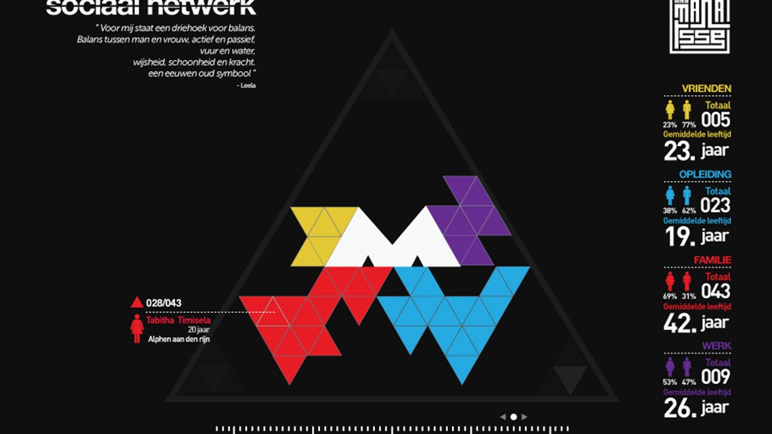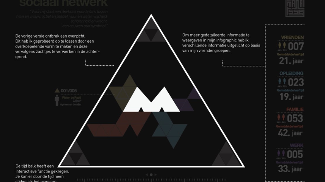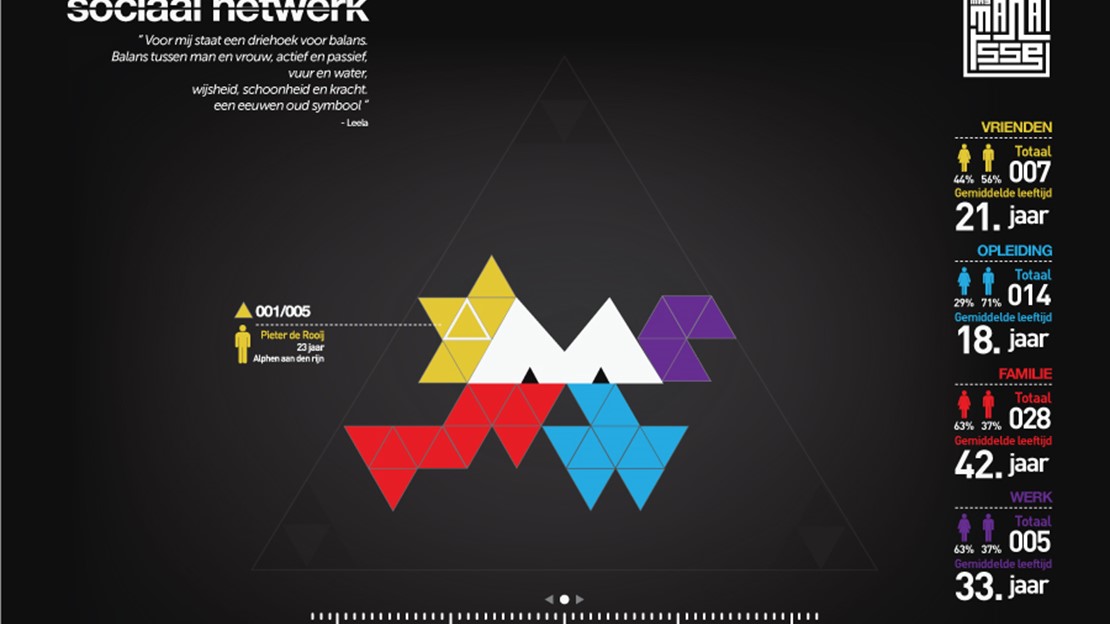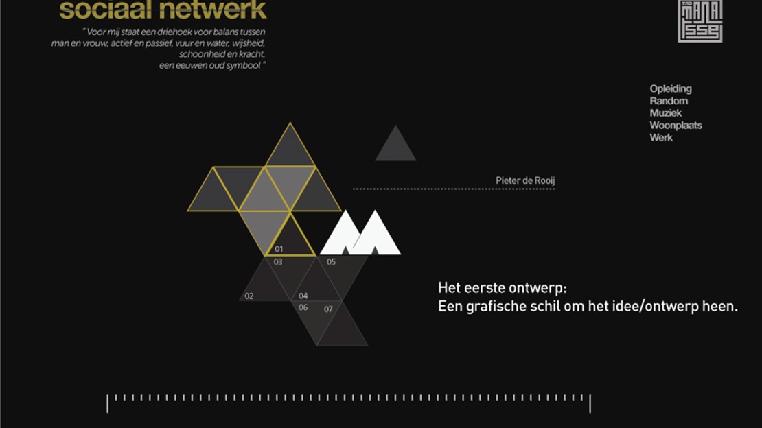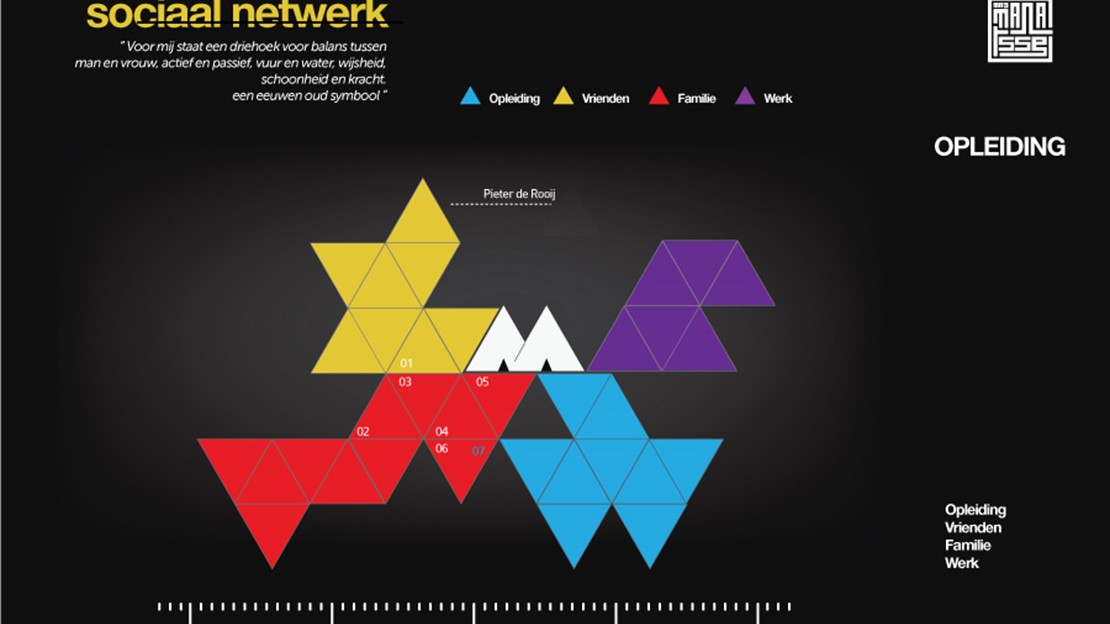 Mijn inspiratie voor dit ontwerp kwam neervallen vanuit verschillende hoeken. Het leidde er mij toe om te gaan werken met driekhoeken. Spelende wijs ben ik hiermee mijn sociale netwerk in kaart gaan brengen.