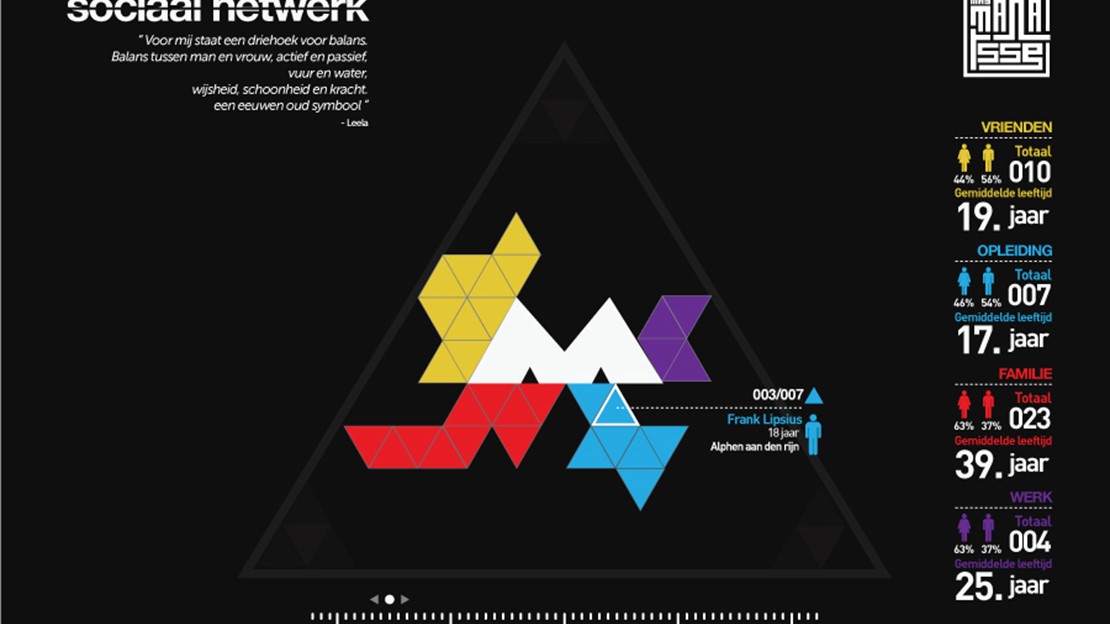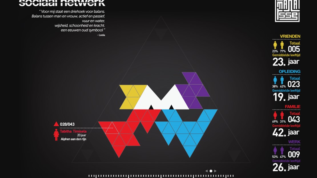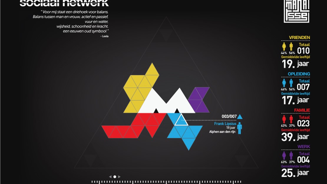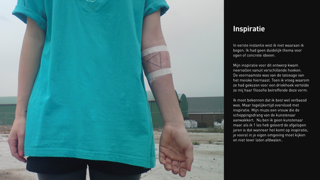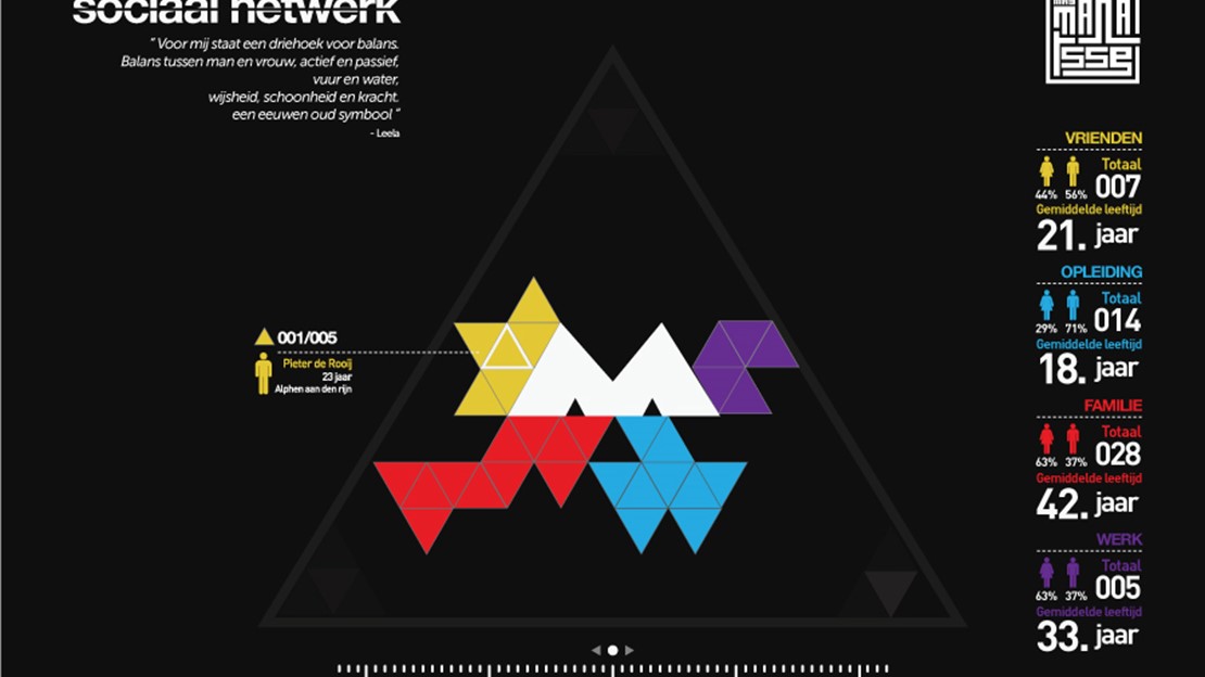 Mijn inspiratie voor dit ontwerp kwam neervallen vanuit verschillende hoeken. Het leidde er mij toe om te gaan werken met driekhoeken. Spelende wijs ben ik hiermee mijn sociale netwerk in kaart gaan brengen.