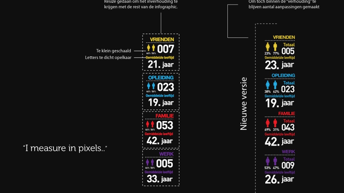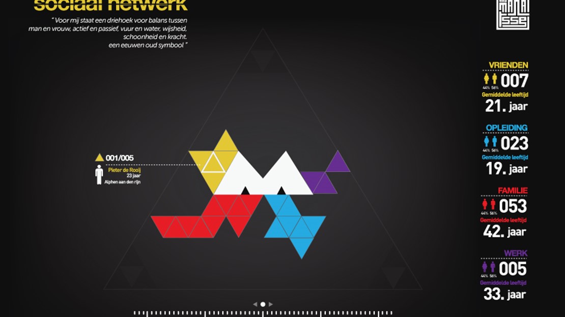 Je ontwerpt een dynamische infographic. Deze infographic vertelt welke informatie jij belangrijk vindt in je persoonlijke netwerk. Het resultaat is interactief, dwz als er een variabele verandert verschuift ook de informatie die daaraan gekoppeld is.