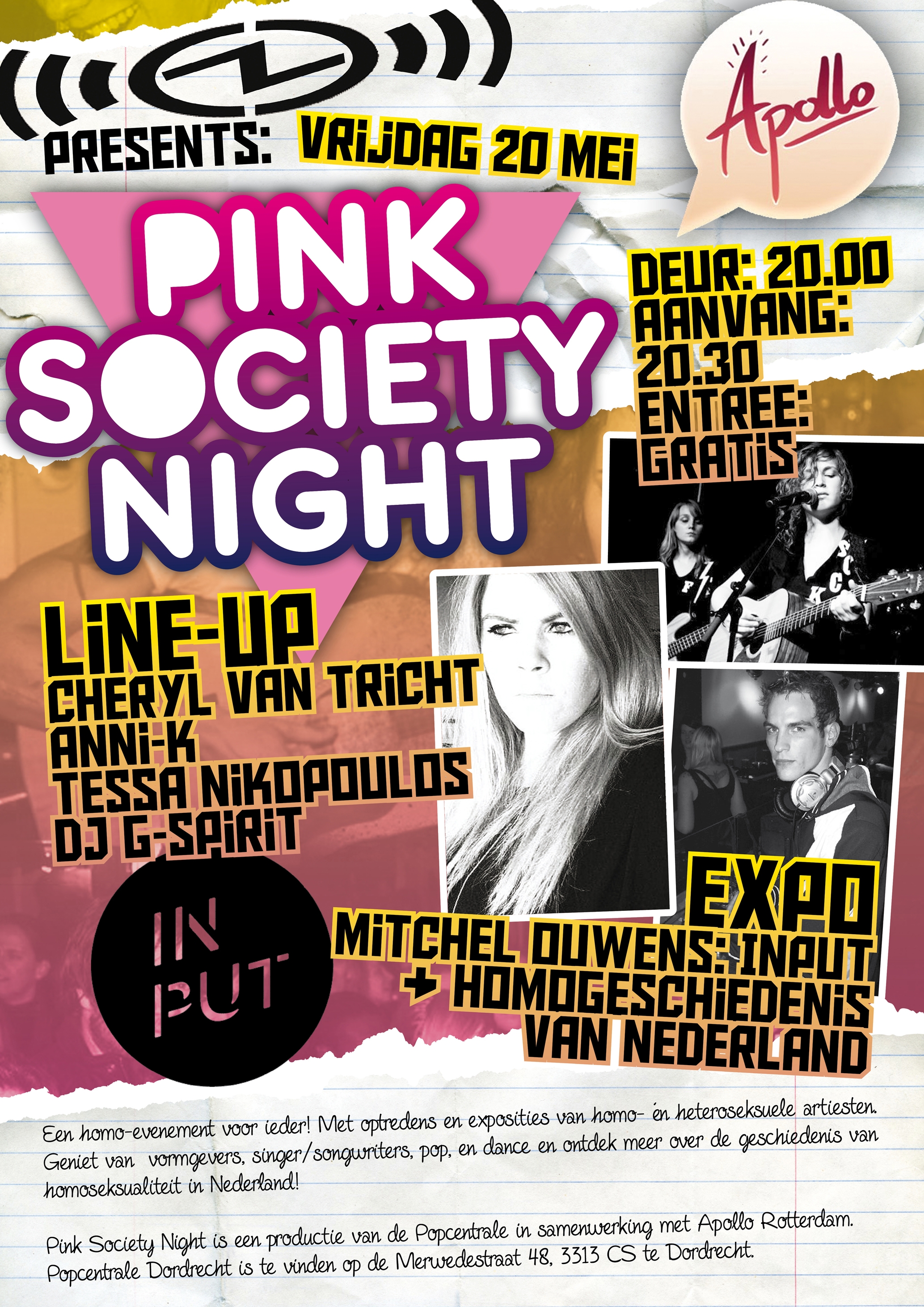 Met de groeiende intolerantie jegens homoseksuelen in Nederland heeft de Popcentrale Dordrecht besloten haar deuren te openen en deze doelgroep te ondersteunen. Student Elmer is gevraagd om in samenwerking met verschillende instellingen en organisaties, die zich hoofdzakelijk inzetten voor en met de homogemeenschap, een avond te organiseren gericht op deze doelgroep.
