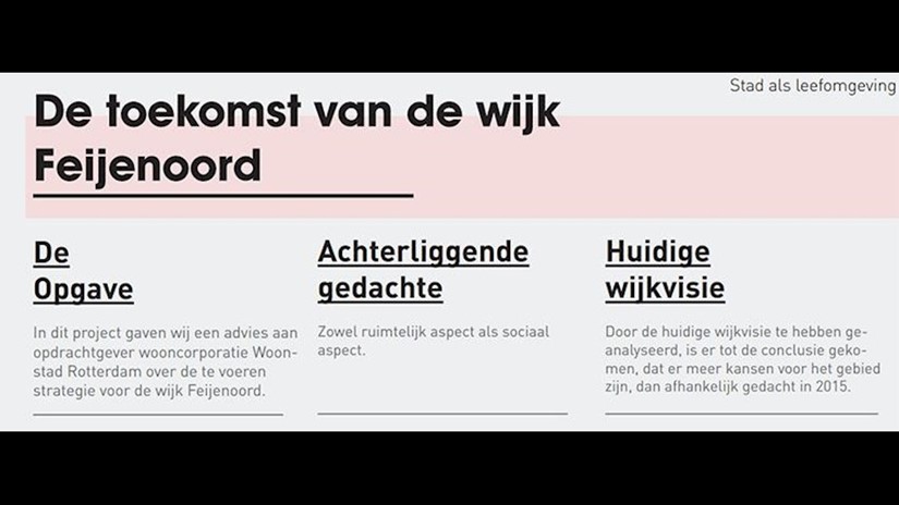 In dit project wordt er advies gegeven aan opdrachtgever wooncorporatie Woonstad Rotterdam over de te voeren strategie voor de wijk Feijenoord. Omdat de bestaande wijkvisie uit 2015 op sommige punten verouderd is, gaat het advies in op een update daarvan. Hierbij worden de gevolgen van de nieuwe woningwet en recente economische ontwikkelingen – voor zowel Woonstad Rotterdam als voor bewoners en andere partners in de wijk - meegewogen. In het advies wordt ook meegenomen op welke manier Woonstad Rotterdam zou moeten reageren op het veranderde gemeentelijk beleid (Woonvisie 2030).