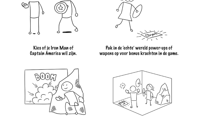 Een brainstorm was de start van het project. Welke superhelden zijn er allemaal? Wat zijn hun motieven of krachten? Waar zijn zij gespecialiseerd in en wat kenmerkt hen? Vervolgens is er gekeken hoe deze specifieke kenmerken omgezet kunnen worden naar een game. Zodoende ontstond het idee om een motion game te maken waarbij kinderen zich kunnen inleven als Iron Man of Captain America. Door handbewegingen te maken kunnen zij schieten of verbergen achter een schild. Verschillende facetten kwamen aan bod, o.a: character design, sound design, testen bij kinderen op de basisschool, UI design.
