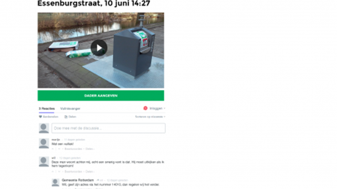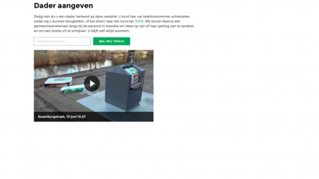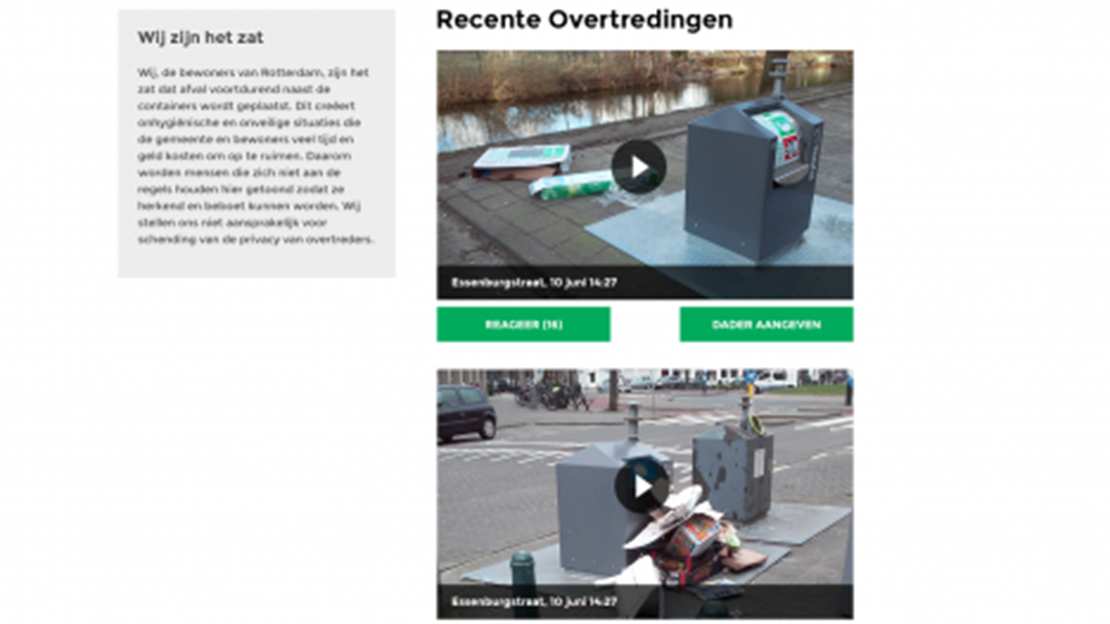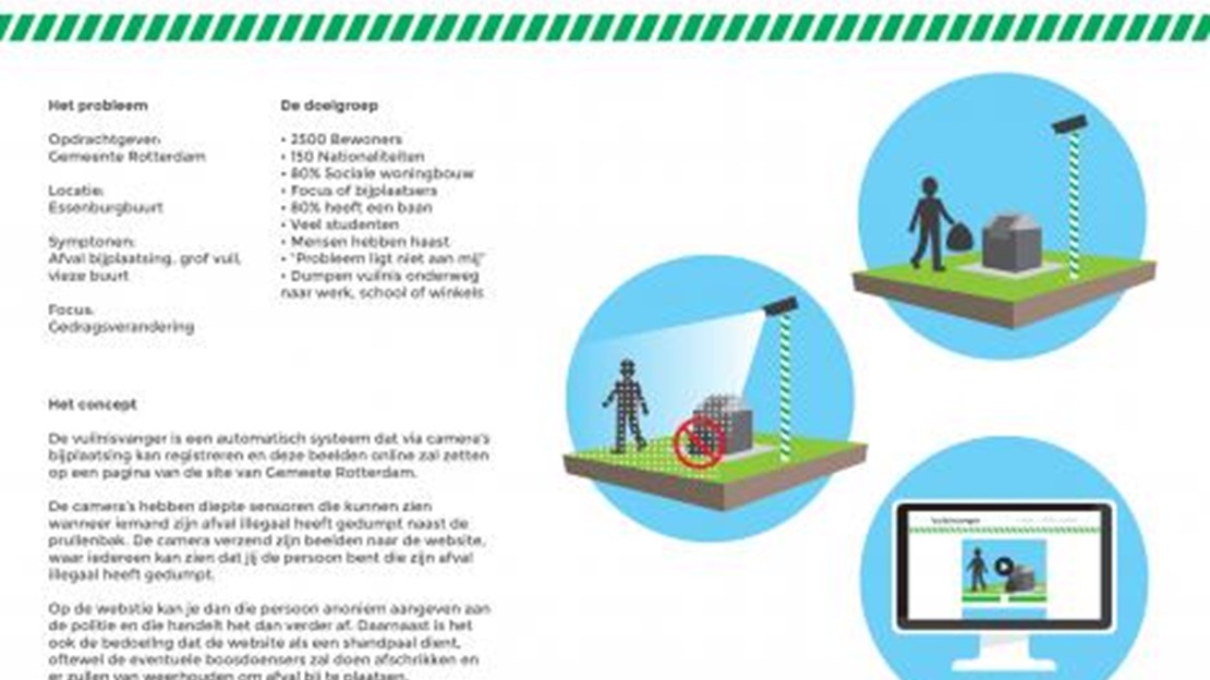 Een 3D-beveiliginscamera die herkent dat mensen afval bijplaatsen en het beeldmateriaal automatisch uploadt. Overtreders worden openbaar getoond op de Vuilnisvanger website zodat burgers kunnen helpen bij de identificatie van mensen die afval bijplaatsen. Zo kunnen overtreders opgespoord worden en een boete ontvangen. Deze aanpak ligt in lijn met het beleid van de gemeente Rotterdam en spreekt bewoners aan die alles al geprobeerd zijn het genoeg hebben van het probleem.