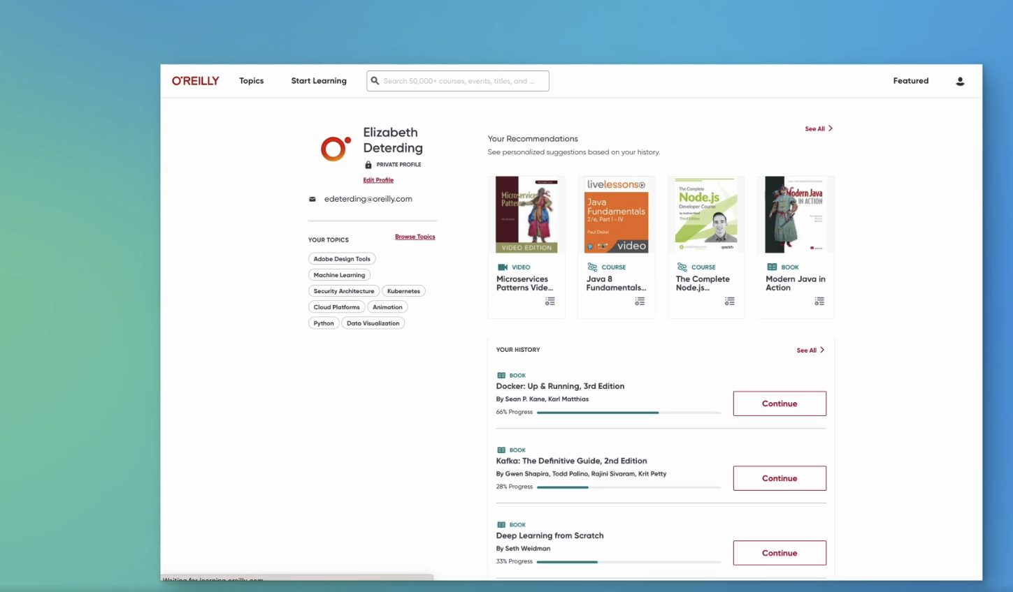 Learning O'Reilly is een Engelstalig online leerplatform gericht op ICT vaardigheden. Het biedt tienduizenden e-books en vele video's, case studies en "learning paths", waarbij je zelf je voortgang kunt monitoren.